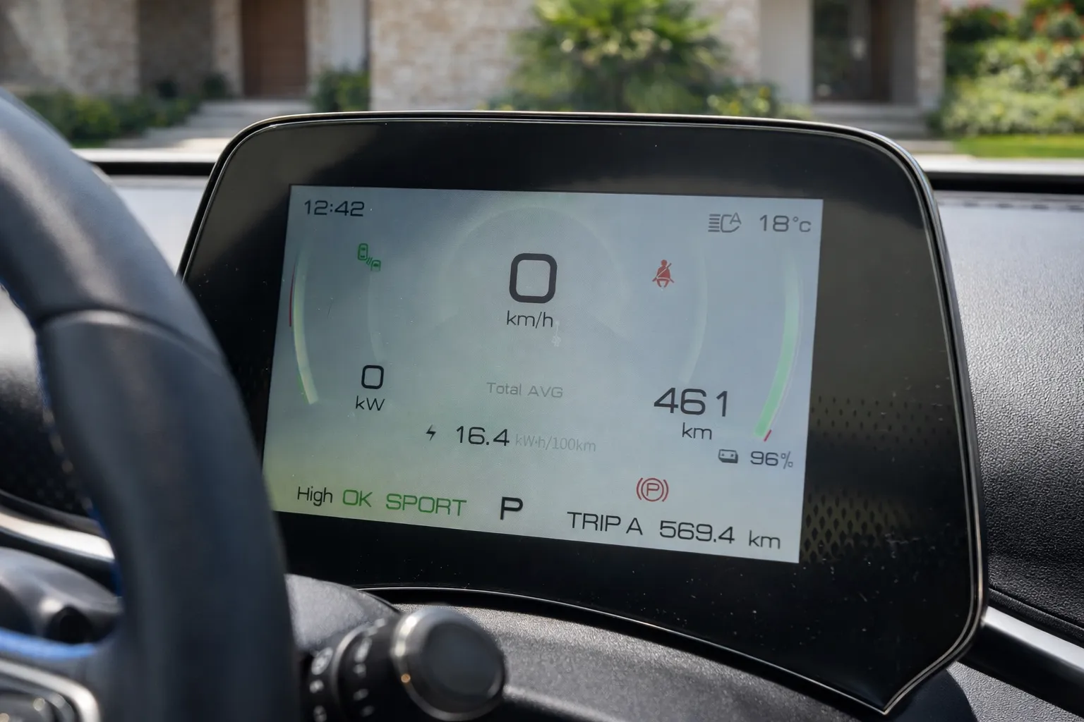 Em termos de conectividade, a proposta do modelo reforça a leitura de veículo tecnologicamente posicionado. O condutor não encontra apenas tela, mas um ambiente pensado para facilitar acesso a funções principais, visualização de parâmetros de condução e convivência com a eletrificação no uso real. Isso é especialmente valioso para quem está migrando do carro térmico para o elétrico pela primeira vez.