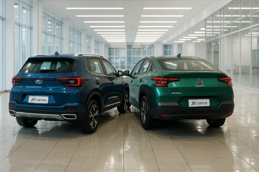 No comparativo carros entre o Chery Tiggo 5x Sport e o Citroën Basalt Feel Turbo 2026, fica claro que o Tiggo entrega mais potência, autonomia e refinamento de suspensão, enquanto o Basalt oferece preço mais baixo, consumo melhor e maior porta-malas.