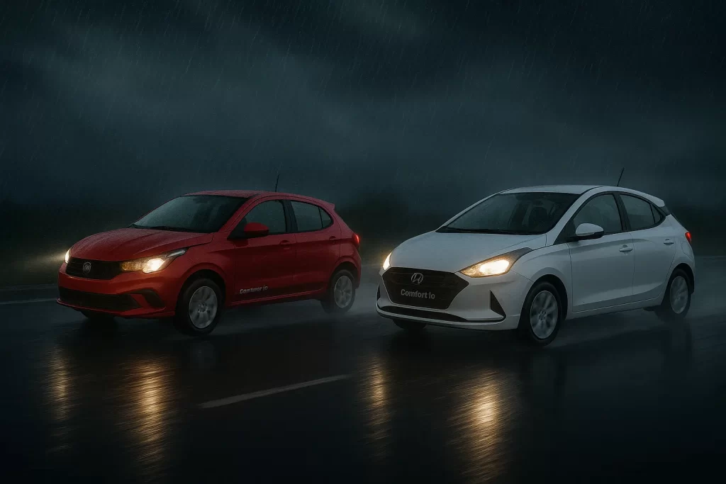 Por outro lado, quem valoriza tecnologia embarcada desde a versão básica, acabamento mais moderno e bom valor de revenda, encontrará no Hyundai HB20 Comfort 1.0 um hatch compacto mais equilibrado.