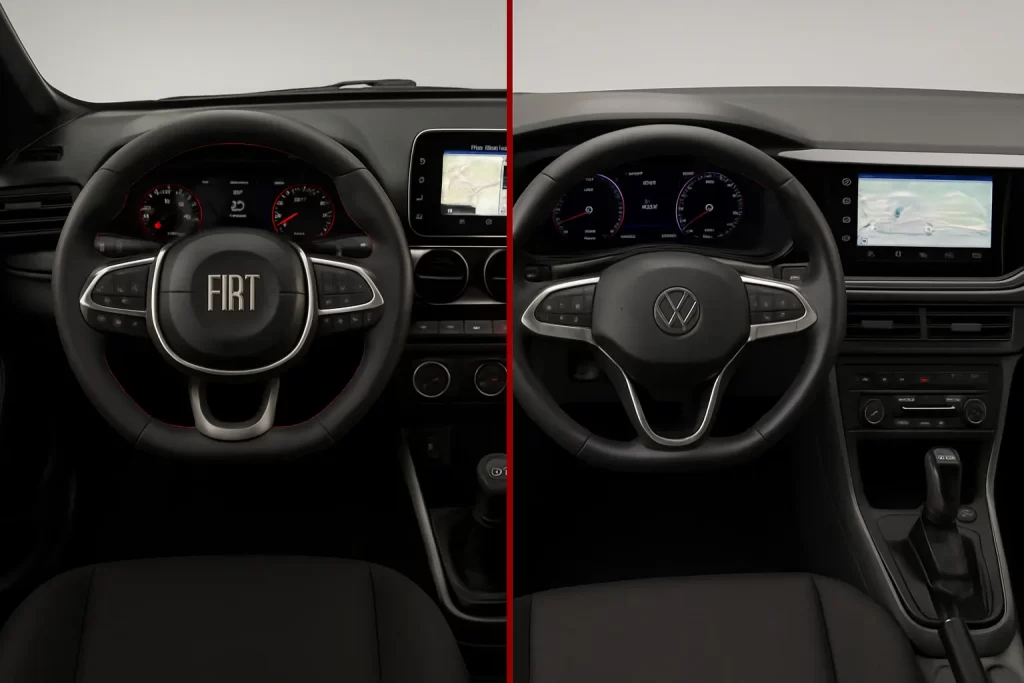 O VW Tera, por sua vez, aposta na conectividade: painel digital, central VW Play com 10″, carregador por indução, 6 airbags, ar digital e controle de cruzeiro, mesmo na versão de entrada manual.