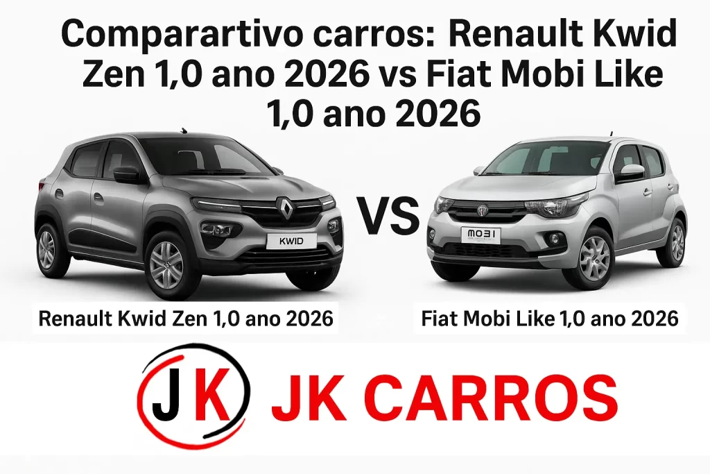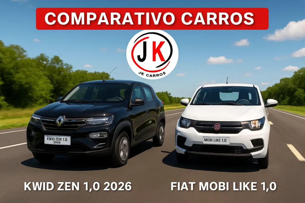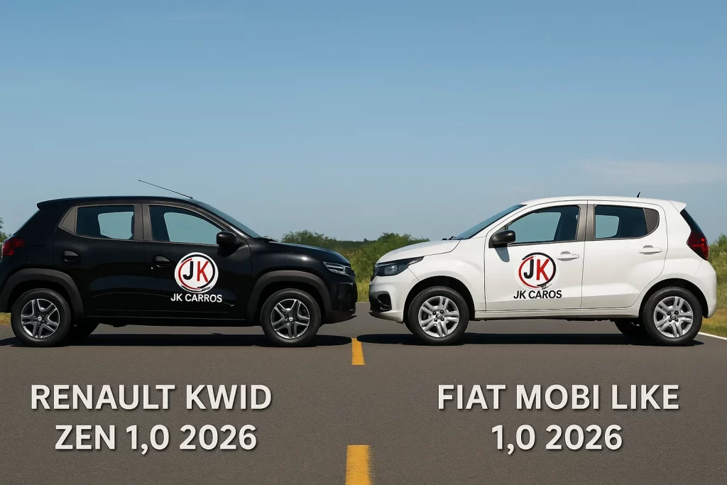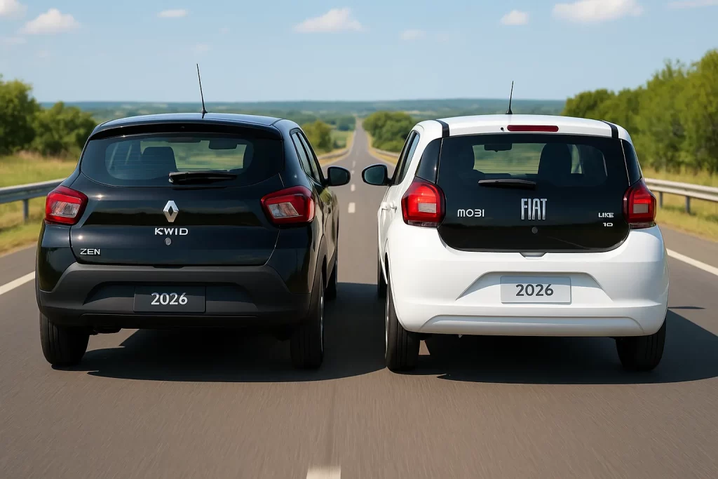 No segmento dos subcompactos de entrada, dois modelos se destacam no mercado brasileiro em 2026: o Renault Kwid Zen 1.0 e o Fiat Mobi Like 1.0.