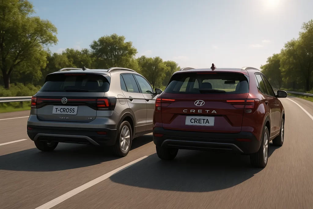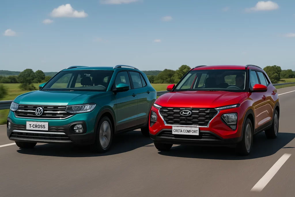 O Volkswagen T-Cross 1.0 TSI AT e o Hyundai Creta Comfort 1.0 TGDI AT. Ambos equipados com motores 1.0 turbo e câmbio automático de seis marchas, trazem pacotes robustos de segurança e conectividade, voltados a um público urbano exigente.