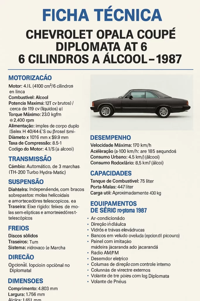 Ficha Técnica carros Chevrolet Opala Coupé Diplomata AT 6 cilindros a álcool ano 1987