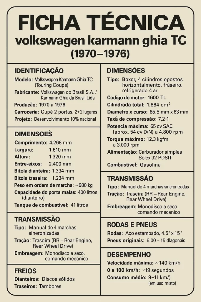 Ano de lançamento: 1970; Produção: 1970 a 1976; Fabricado por: Volkswagen do Brasil em parceria com a Karmann-Ghia do Brasil Ltda, em São Bernardo do Campo (SP).