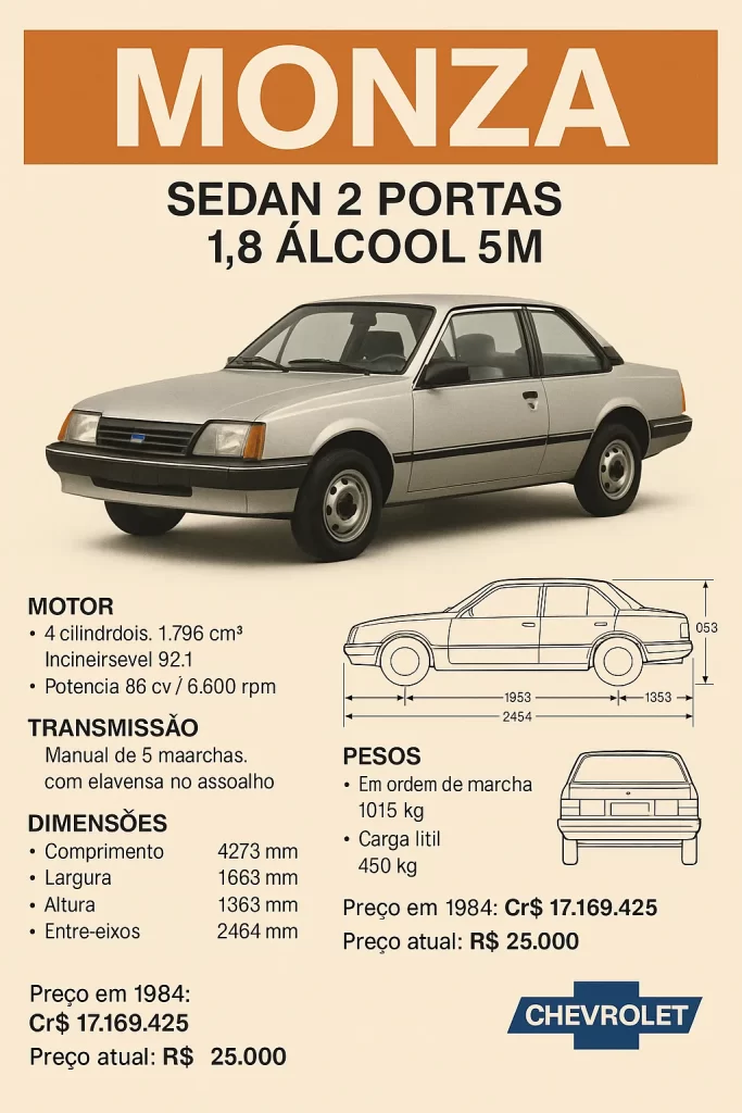 • Preço zero km em 1984: Cr$ 14.800.000 (cruzeiros) – valor médio de tabela para o Monza Sedan 2p Standard 1.8 Álcool 5M;