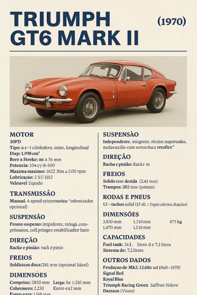 Produzido entre 1968 e 1970, é uma clássica coupé esportiva britânica da Triumph Motor Company, famosa por seu design elegante e motor de seis cilindros em linha.
