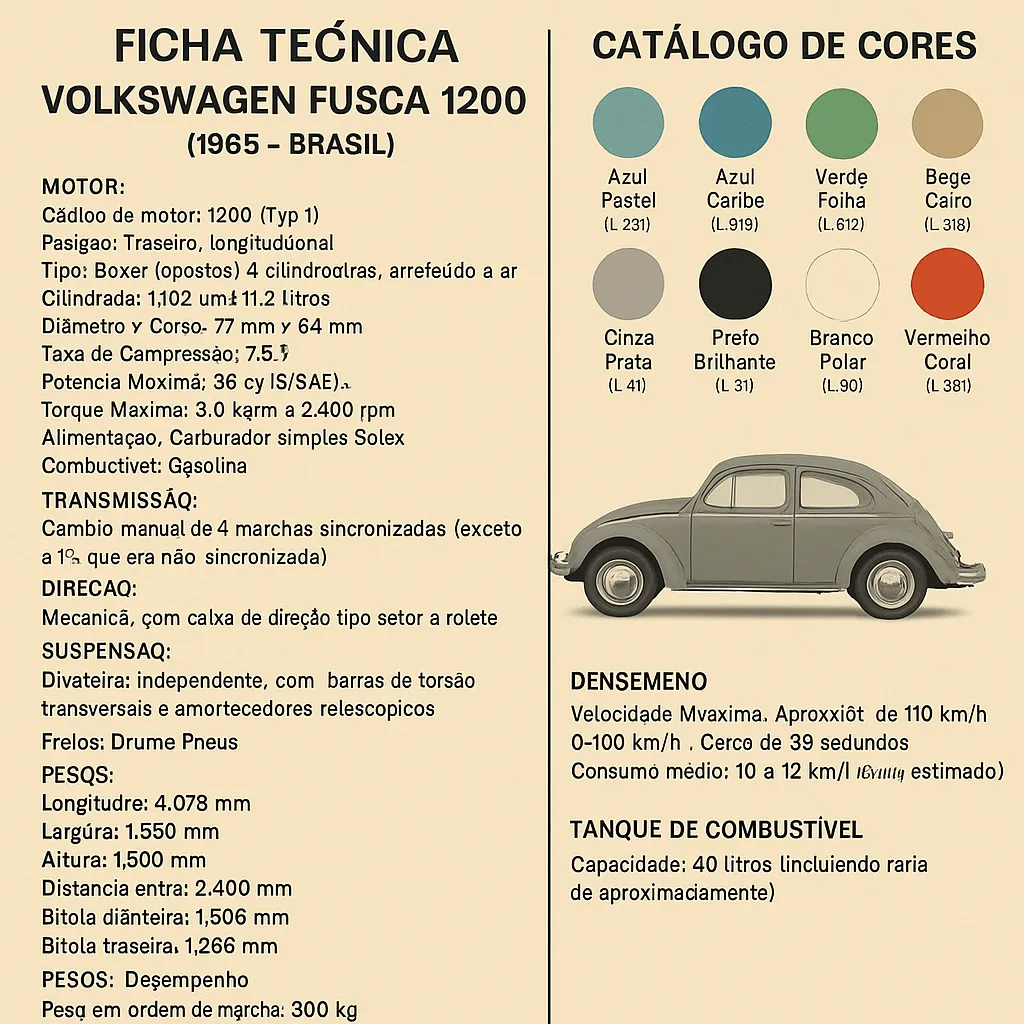 Ficha Técnica carros Volkswagen Fusca 1200 Sedan ano 1965