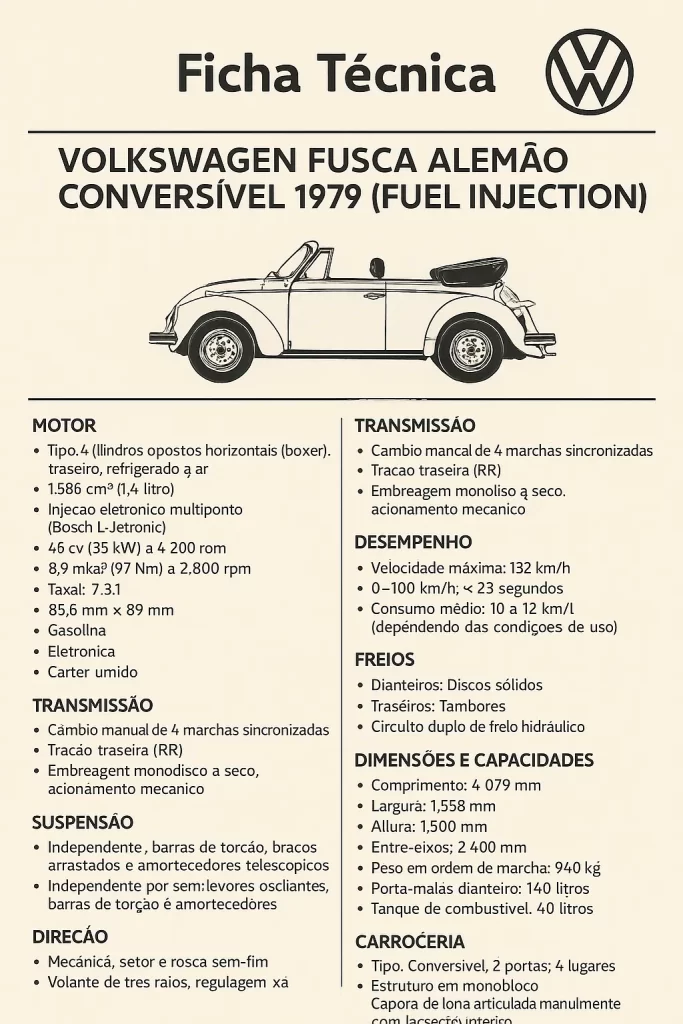 O Volkswagen Fusca Alemão Conversível 1979 Fuel Injection é hoje um dos modelos mais valorizados da linha Type 1, principalmente por três fatores: