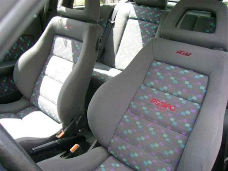 O interior era sempre escuro, com bancos Recaro revestidos em tecido cinza ou grafite, dependendo do acabamento.