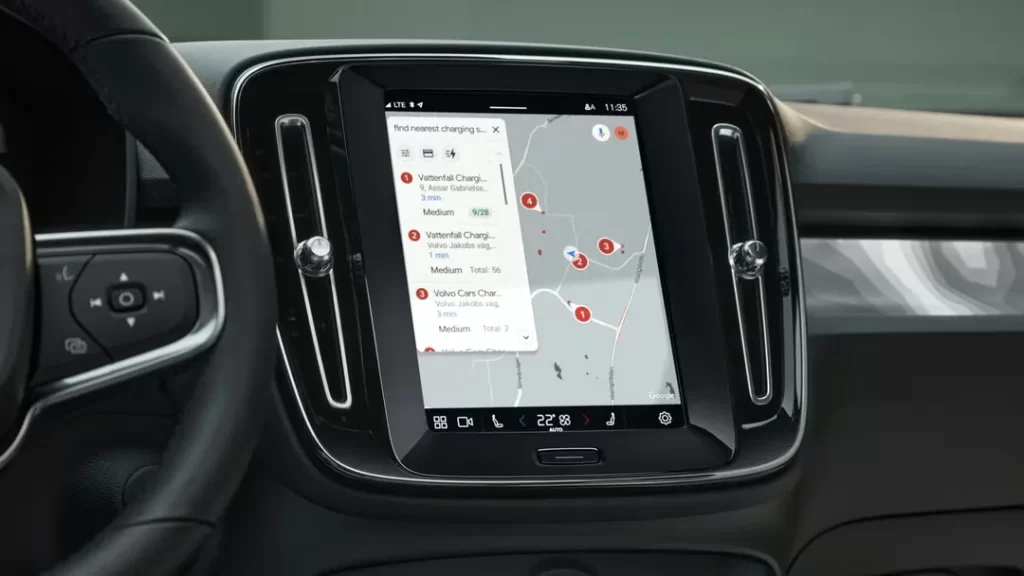 O Volvo EC40 Plus 2026 vem com painel digital de 12,3 polegadas e central multimídia vertical de 9 polegadas com sistema operacional Android Automotive, integração com Google Assistant, Apple CarPlay e Android Auto.