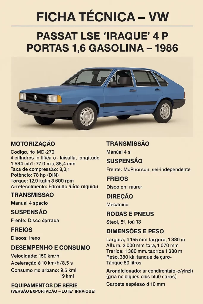 Ficha Técnica completa Passat LSE 4 portas Iraque ano 1986