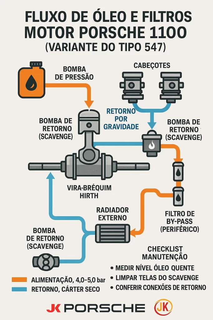 Tanque externo → (linha de alimentação) → Bomba de pressão → galerias principais → mancais de virabrequim Hirth (rolos) → subidas às cabeças (comandos/tuchos) → retorno por gravidade para o cárter intermediário → Bomba de retorno (scavenge)radiador externo (com termostato) → tanque.