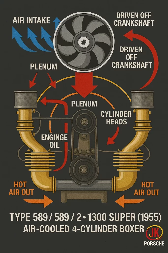 Em um motor boxer traseiro e a ar, como o Porsche 356 1300 Super, o sistema de refrigeração é tão crítico quanto o conjunto móvel. A lógica é: