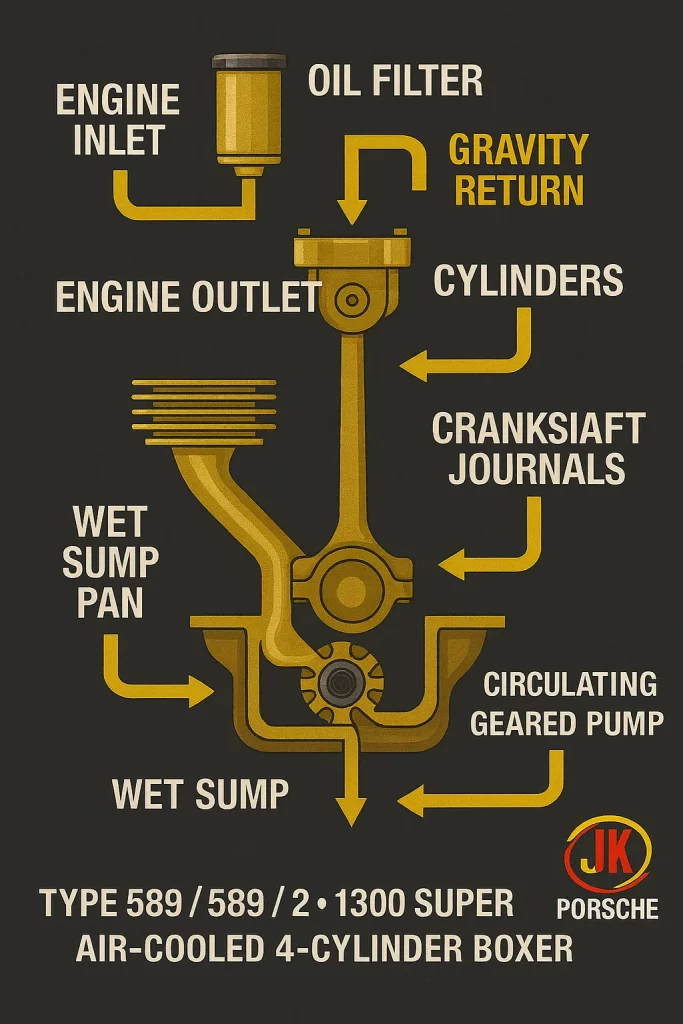 Ao contrário dos motores de competição com dry sump completo, o 356 pushrod (incluindo o 1300 Super) trabalha com um sistema de lubrificação tipo wet sump, com bomba interna e retorno por gravidade, complementado por um circuito de resfriamento de óleo com cooler no fluxo de ar da ventoinha.