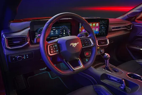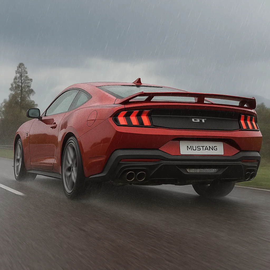 O centro de gravidade baixo e o posicionamento recuado do motor ajudam no equilíbrio dinâmico, reforçando a tradição do Mustang como esportivo de tração traseira com comportamento previsível e emocionante.