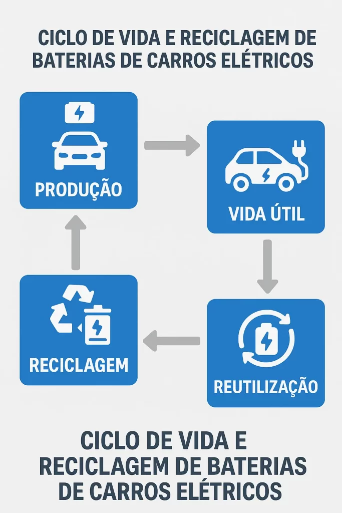 3. Economia Circular e Cadeia Sustentável: Fabricantes de veículos e baterias investirão fortemente em cadeias produtivas circulares, onde o resíduo da bateria antiga será matéria-prima da nova, diminuindo a dependência de mineração.