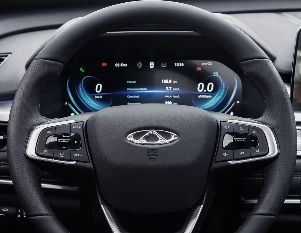 O interior do Tiggo 7 Pro Max Drive impressiona pelo acabamento e lista de equipamentos. O painel digital de 12,3” é integrado a uma central multimídia com tela touchscreen de mesmo tamanho, compatível com Android Auto e Apple CarPlay sem fio.