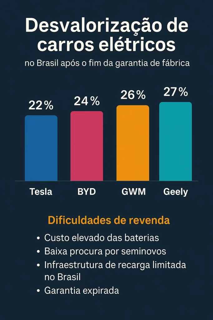 Após o fim da garantia de fábrica – que geralmente varia entre 3 e 5 anos para o veículo e de 6 a 8 anos para o pacote de baterias, a desvalorização média desses modelos costuma ficar entre 20% e 28% no primeiro ano pós-garantia, podendo superar 35% em casos de marcas com baixa rede de assistência ou menor reputação no país.
