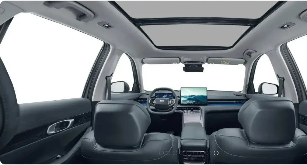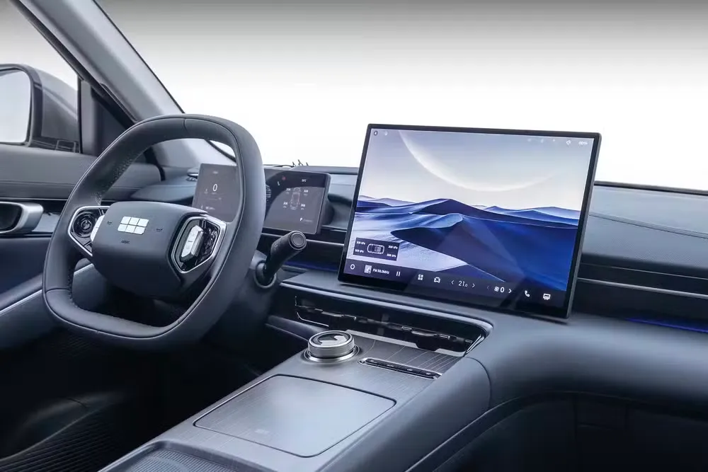 A cabine aposta em um ambiente tecnológico, com acabamento em materiais soft-touch, painel digital de 12,3” e central multimídia vertical de 15,6” com conexão 5G, integração com Android Auto e Apple CarPlay sem fio, além de atualizações remotas (OTA).