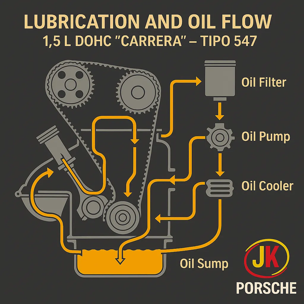 O sistema de lubrificação por cárter seco foi uma das maiores inovações do Tipo 547. Em vez de armazenar o óleo no cárter, o motor utilizava um tanque externo, uma bomba de múltiplos estágios (pressão e retorno) e um radiador de óleo integrado à ventilação traseira do veículo.