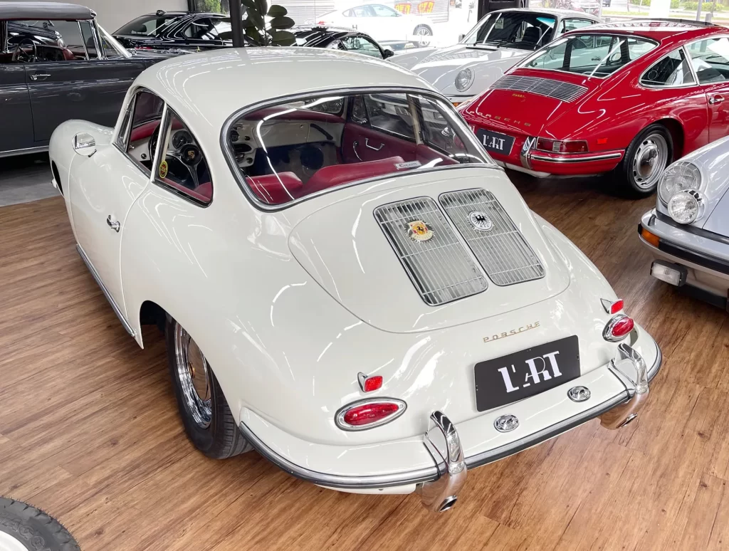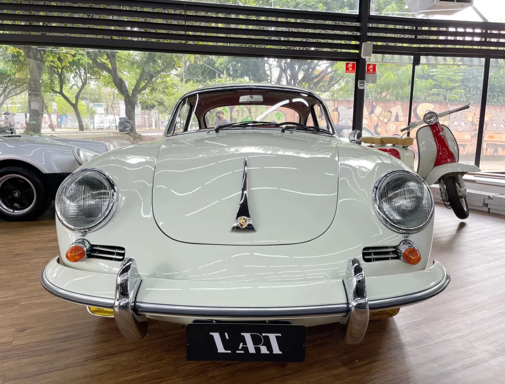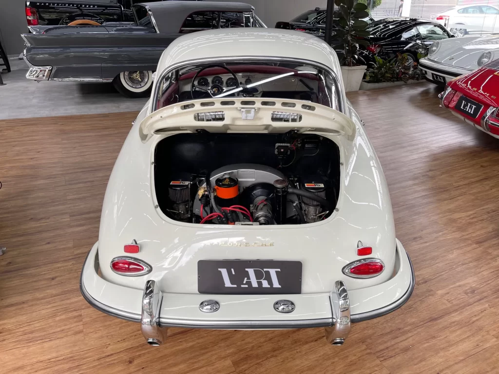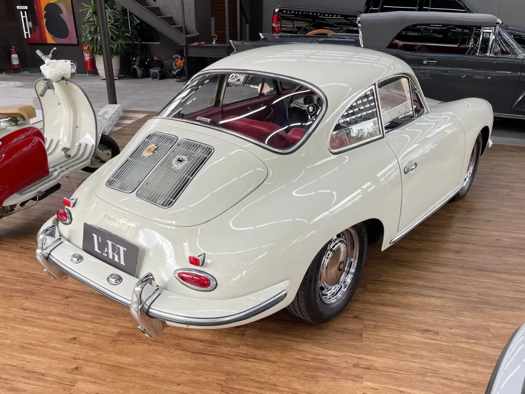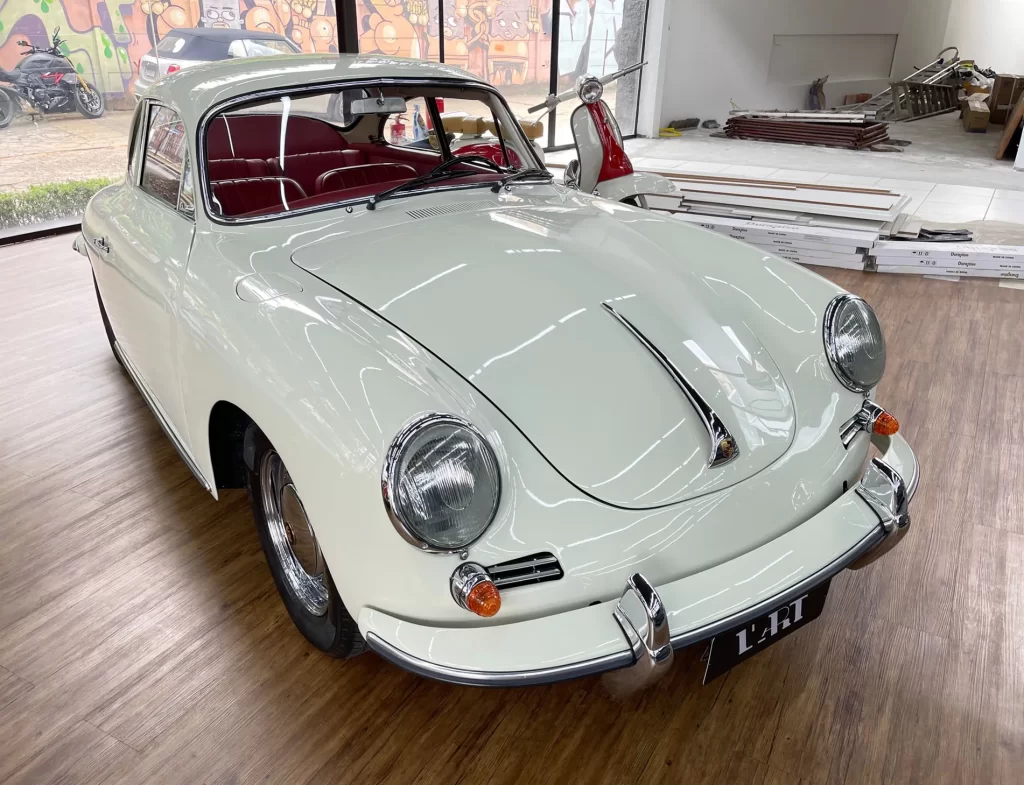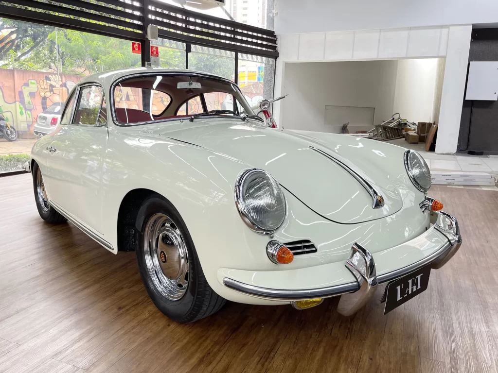 Porsche 356 C 1600 de 95 cv ano 1963, clássico em cor branco Light Ivory (Marfim Claro), disponível à venda. Um ícone da história Porsche com charme atemporal e excelente valorização no mercado de colecionadores.