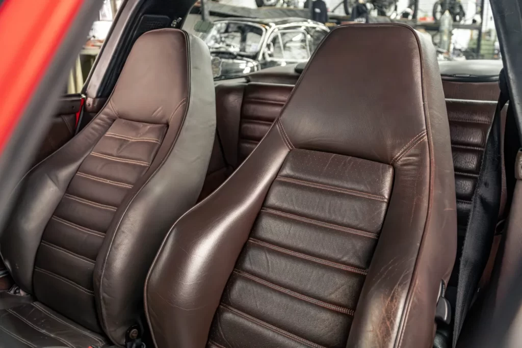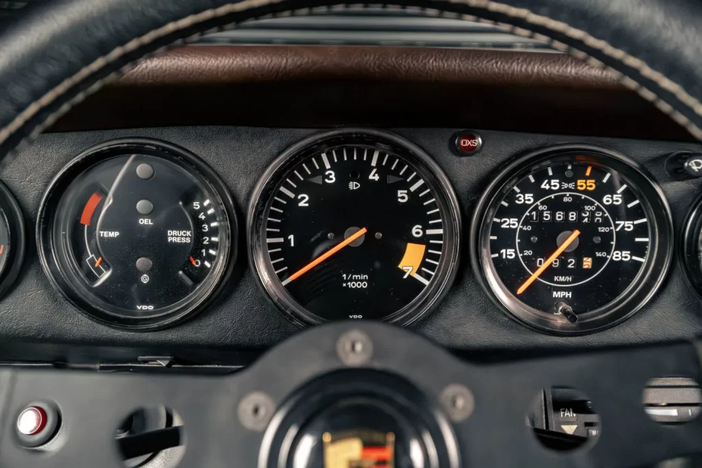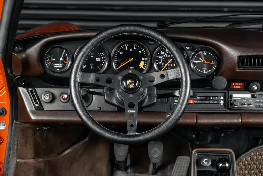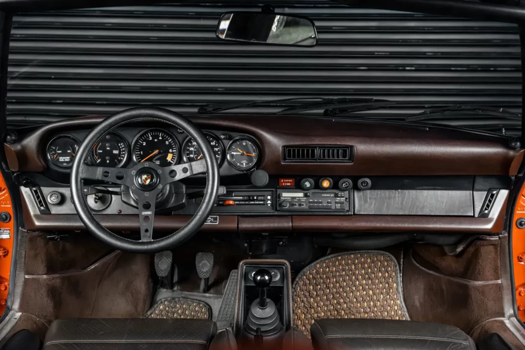 As rodas Fuchs douradas originais da época conferem um toque de exclusividade e esportividade, enquanto o painel marrom original mantém a autenticidade da cabine, apresentando os clássicos instrumentos Porsche de forma clara e funcional.