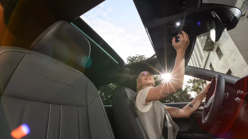 Por dentro, o T-Cross Extreme 2026 oferece um ambiente refinado, com acabamento em material soft-touch no painel, detalhes em black piano e bancos revestidos em couro ecológico.